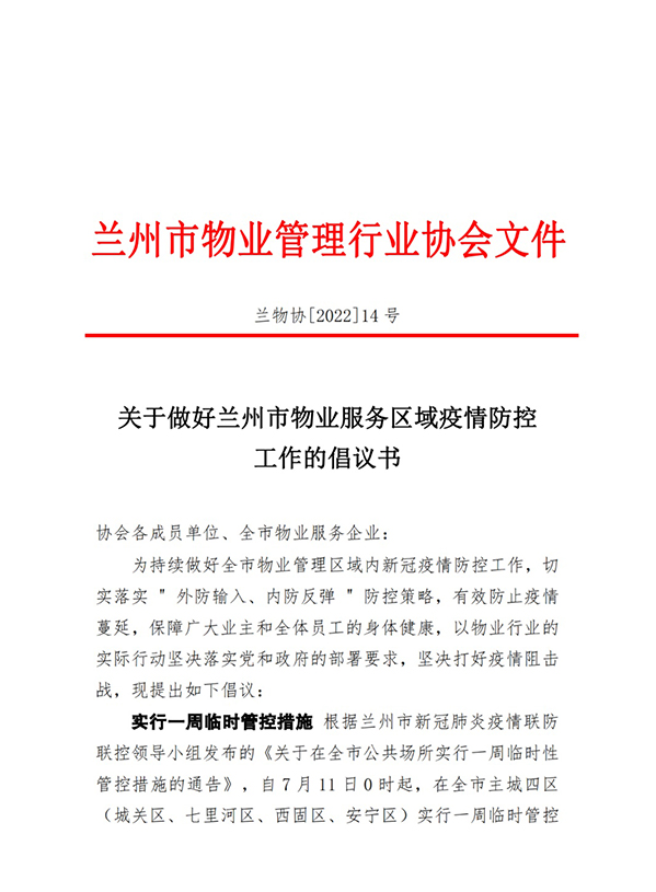 關(guān)于做好蘭州市物業(yè)服務(wù)區(qū)域疫情防控工作的倡議書